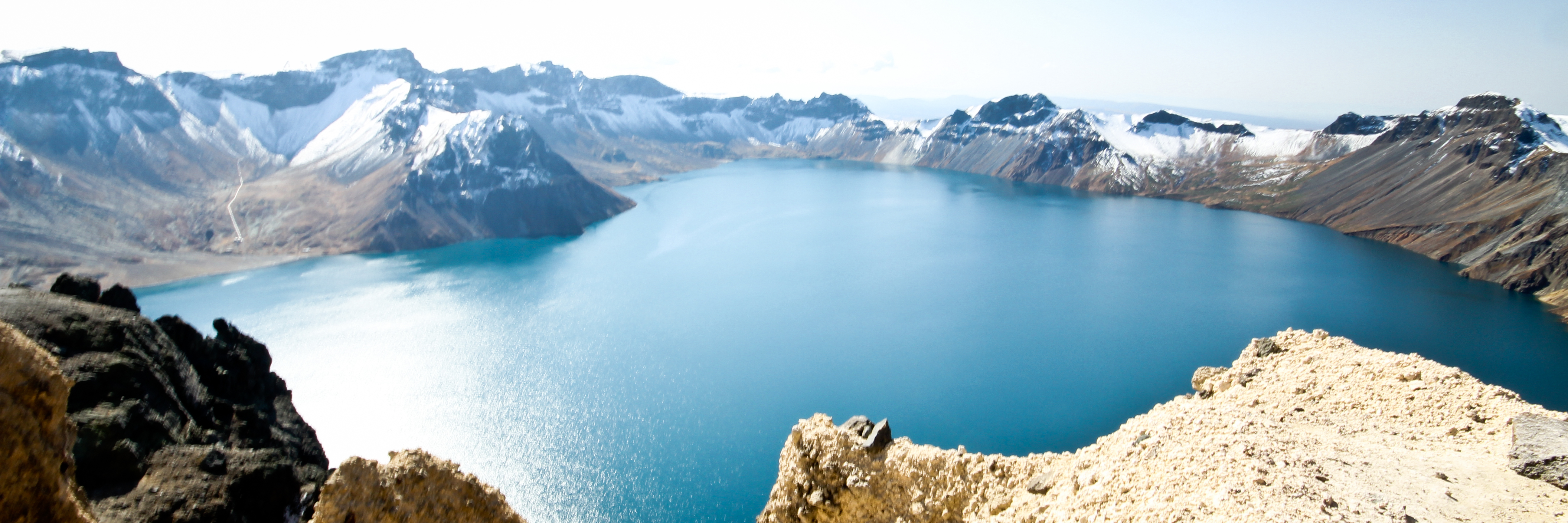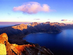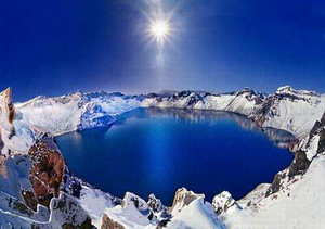 Changbaishan is a mountain that lies on the border of North Korea and China (in Jilin Province). It is a dormant volcano with a lake in the middle (sort of like our Crater Lake in Oregon). Here’s a photo I stole from a website: