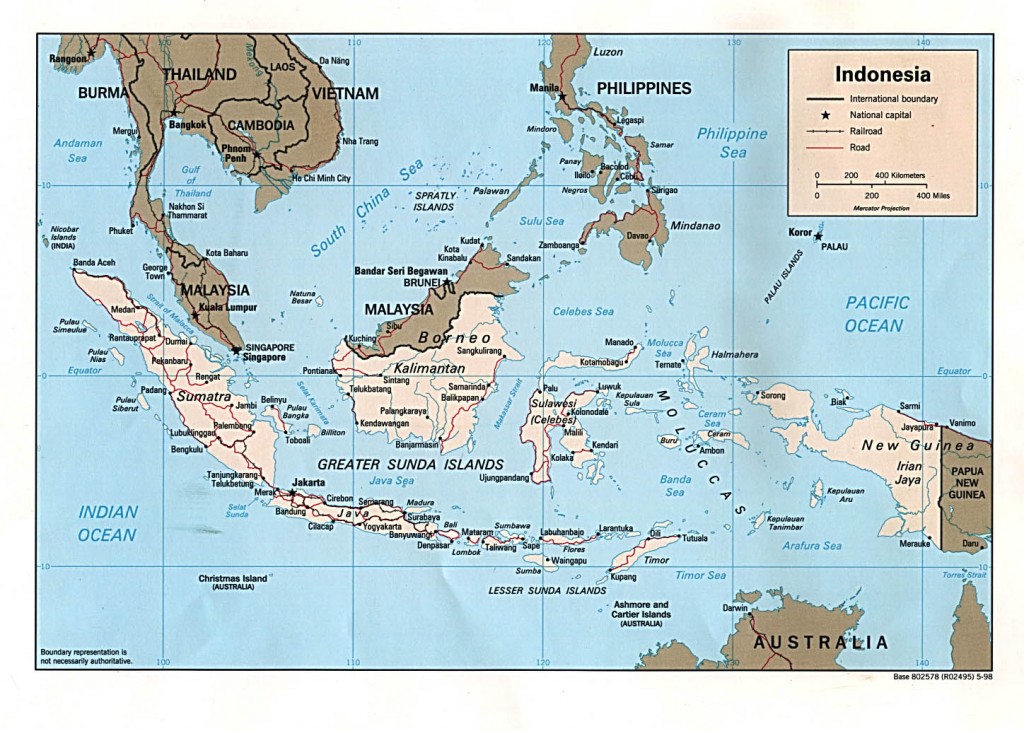 Here’s a map of Indonesia. I think it’s a political map from 1998. I don’t know if anything has changed since then…I assume it’s not like Africa where borders change daily. Singapore is the tip of Malaysia (peninsular Malaysia) and cousin Robin lives in the far eastern part of Indonesia. We won’t make it to her house. 🙁 We will try to make it to a lot of the other places! The westernmost island is Sumatra (lots of volcanic activity here…It “moves the world like no other place on earth”), the next island is Java (home to more volcanoes, temples, coffee plantations, then onto Bali, Lombok, and Nusa Tenggara (home to Komodo Island where the Komodo dragon lives! I hope to see this!)