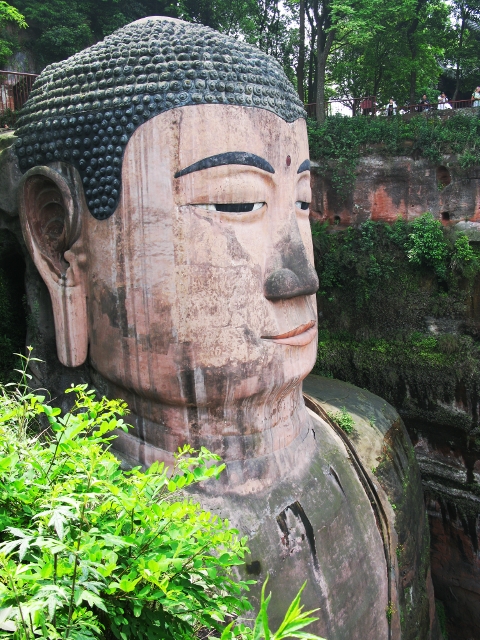 Our first day in and around Chengdu was spent outside of the city about 2 hours.  We first went to Le Shan乐山, which literally means “happy mountain”.  It was a beautiful bus ride out to Le Shan city.  The hills were covered with tea.  I thought maybe it was rice at first but then we asked someone what it was.  I didn’t take any photos in the bus. You’ll have to take my word for it.  We arrived in Le Shan city and had to transfer to a local bus to take us the Le Shan giant buddha.  Ever since I saw the picture in the Lonely Planet, I wanted to see this. 🙂  We had a little climb before we got to the top of the buddha’s head.  (Not like the climb up Taishan)