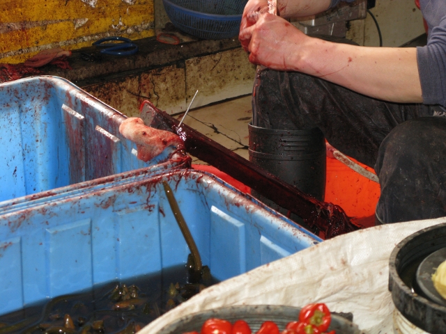 This man was skinning snakes. The snakes were still alive and trying to climb out of the blue bin. Gross.