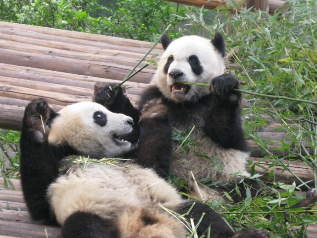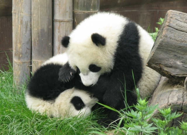 It looks like they are playing. Or maybe they are fighting over the bamboo. Either way, it's pretty cute.