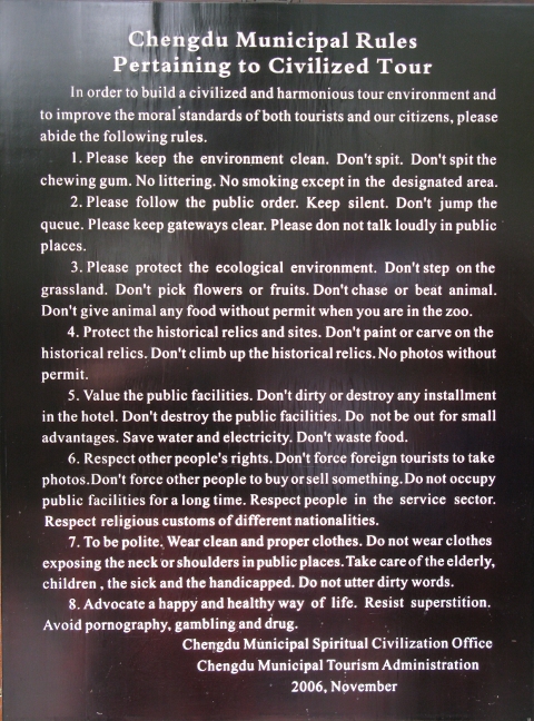 I specifically like #1 "Don't spit", #2 "Don't jump the queue", #3 "Don't step on the grassland", #6 "Don't force foreign tourists to take photos", and #7 "Do not utter dirty words"! 🙂 🙂
