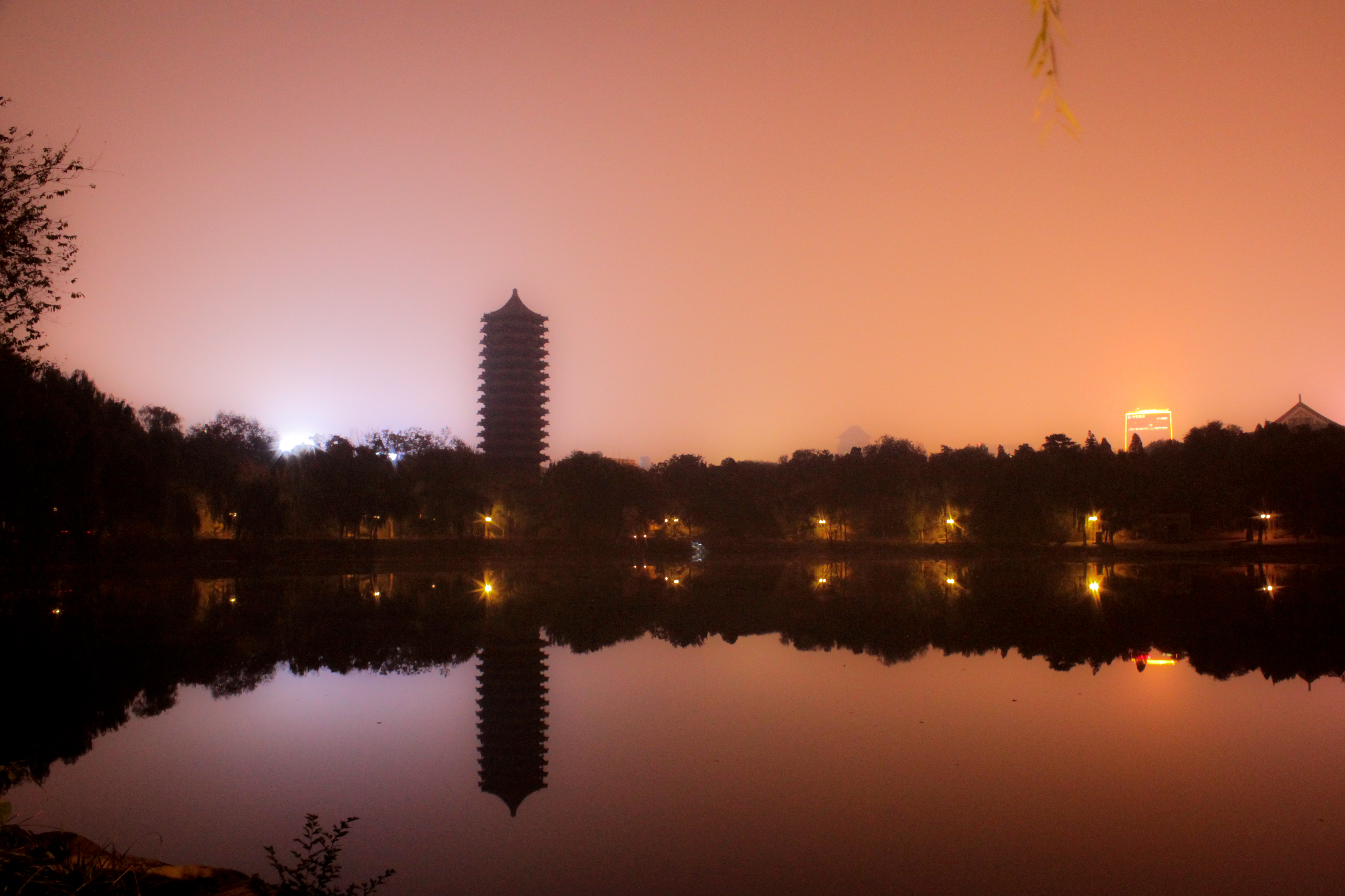 This was a late night adventure on Peking University Campus. The red sky is due in part to the pollution.