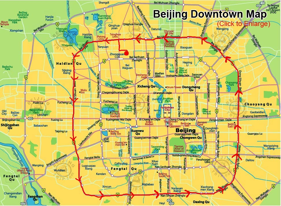 At the center of the city is the former Imperial Palace and the Forbidden City. Just south of that lies Tian’anmen Square and other important government buildings. Between Tian’anmen Square and the Forbidden City is Chang’an Street (Eternal Peace–which I find incredibly ironic, actually). Encircling the Forbidden City is the 2nd Ring Road. A little further out is the 3rd Ring Road, and after that, the 4th Ring Road. Beijing actually has six ‘ring roads’ that encircle each other with the 5th and 6th being furthest away from each other.