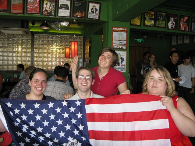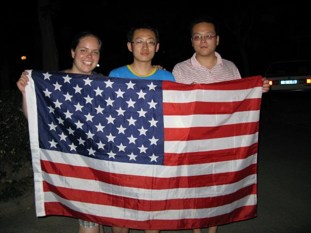 The US National Holiday was celebrated by the Meiguoren with our own ch–ch in the morning, a trip to Haidian ch–ch with quite a few Chinese friends after that, and a visit to Lush for lunch (western restaurant) where they were serving cheap hamburgers and cheap imported beer. I made sure to take my American flag (which was found in my apartment in the beginning of the year) along with me. Happy 4th of July!