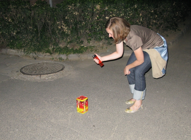 After a fun and delicious lunch most of us went back to another teacher’s apartment to play games! It’s fun to teach our Chinese friends new American games. We dispersed for a bit around suppertime because most of us had made other plans with different friends. (I had invited two students over for Super Mario and other Wii fun!!) But, one of the other teachers had kept a firework (singular) from the Chinese New Year festival! 🙂 So, we shot of one firework 🙂 and then watched National Treasure because we couldn’t find Independence Day. Below are pictures from the ‘celebration.’ 🙂